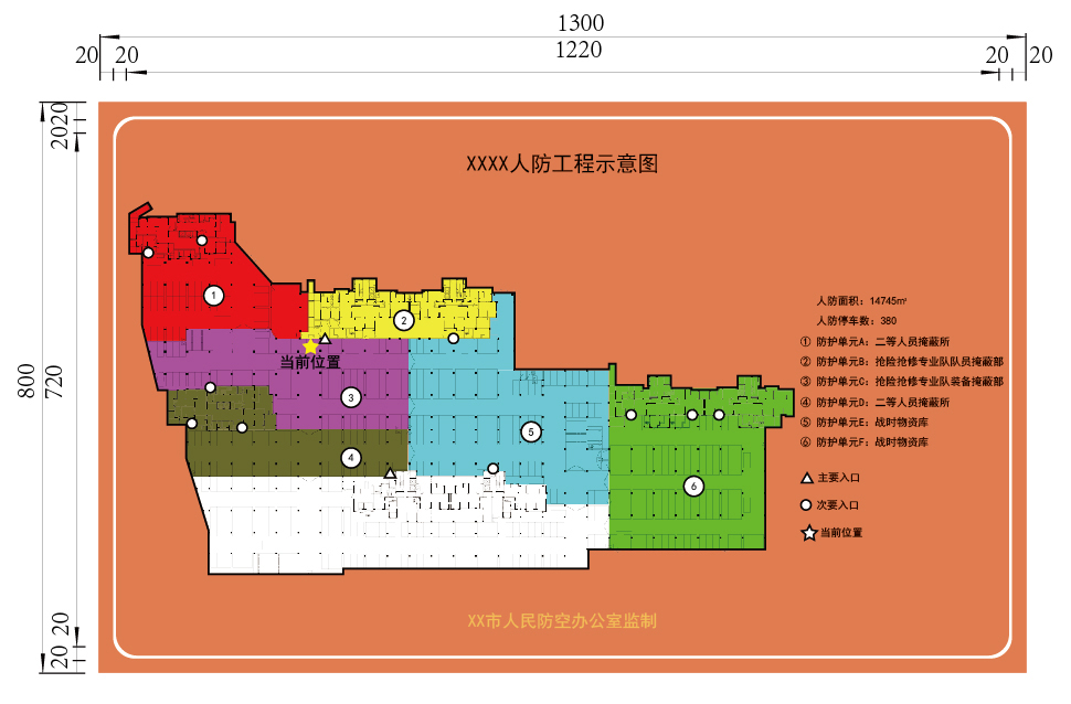 防护单元功能和位置信息标识牌可在《××××人防工程示意图》标识牌的基础上,采用五角星图标☆和文字“当前位置”在示意图上标示安装位置制作而成。标识牌制作要求同2.3条。
