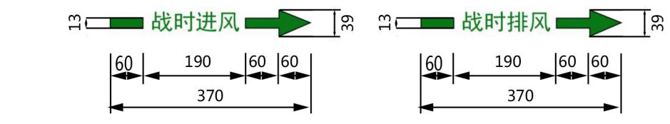 5.7通风类管线标识由管线名称和气流箭形组成。管线名称用汉字标明,如:“战时进风”、“战时排风”、“战时送风”、“战时回风”、“战时进气”、“战时排烟”等,文字及箭形均为绿色RGB(8,119,21),字体为黑体。通风类管线标识样式及尺寸示例见图20。