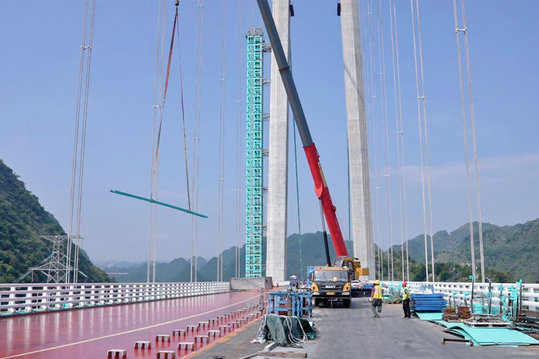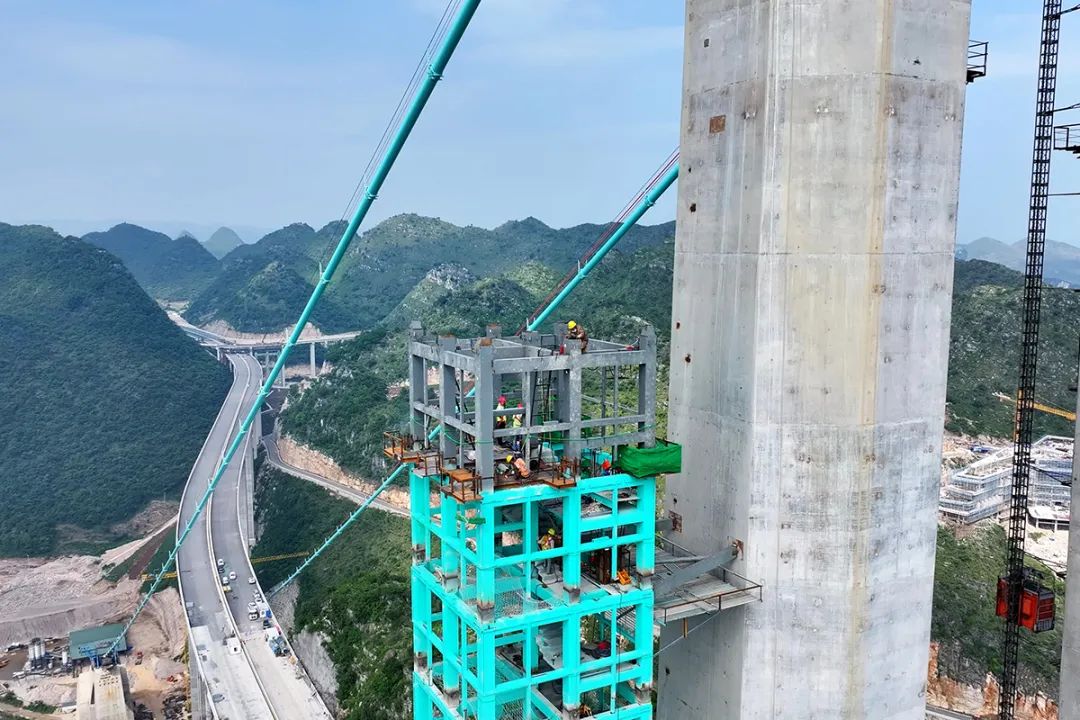除了花江峡谷大桥的高度、长度之外,备受关注的还有其“桥旅融合”上的创新。在进行桥面铺装的同时,大桥的观光电梯、水幕、灯光秀等设施设备均在加紧施工中,特别是207米高的观光电梯已经接近建设尾声,建成后将为游客提供独特的观光体验。