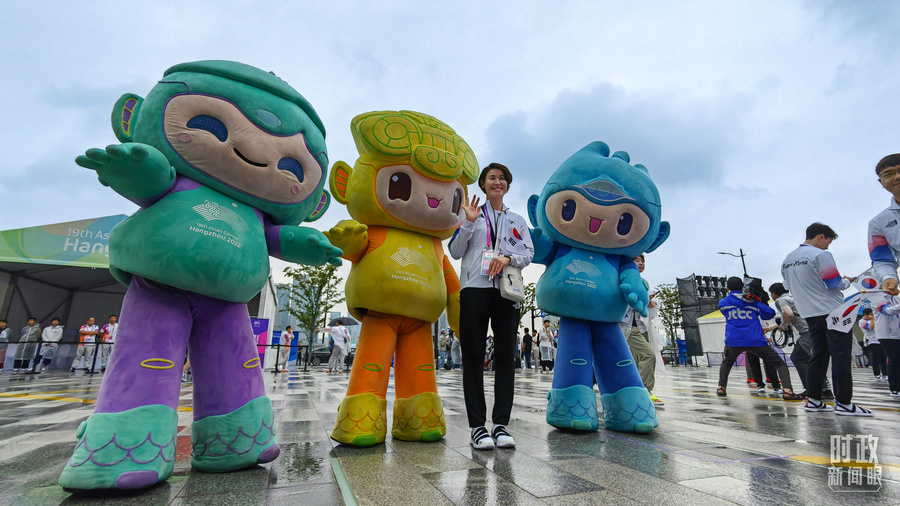 △亚运村为各代表团举行欢迎仪式,队员们纷纷与吉祥物“莲莲”、“琮琮”、“宸宸”合影。(总台央视记者陈伟奎拍摄)