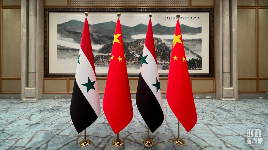 △会见现场摆放的中国、叙利亚国旗。(总台央视记者程铖拍摄)