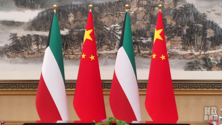 △会见现场摆放的中国、科威特国旗。(总台央视记者曹亚星拍摄)