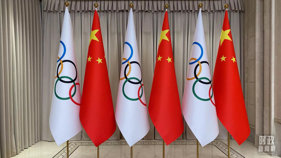 △会见现场摆放的中国国旗和奥林匹克会旗。(总台央视记者李增仁拍摄)