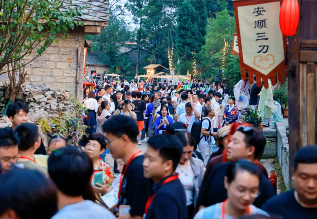 今年国庆期间,云峰屯堡景区“上云峰屯堡·逛明‘潮’市集——沉浸式文化体验活动季”的帷幕正式拉开。活动现场,开屯门仪式、军屯宴、无人机表演等节目轮番上演,沉寂多年的云峰屯堡景区火爆迎客。