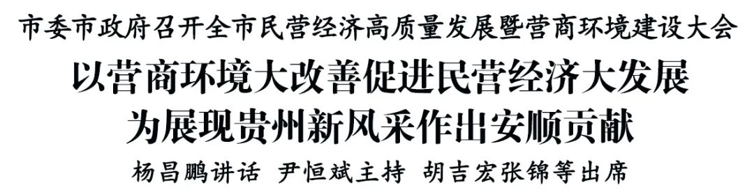 5月23日,市委、市政府召开全市民营经济高质量发展暨营商环境建设大会。市委书记杨昌鹏出席会议并讲话。他强调,要深入学习贯彻习近平总书记关于民营经济发展的重要论述和在贵州考察时的重要讲话精神,贯彻落实全省民营经济高质量发展暨营商环境建设大会部署,以营商环境大改善促进民营经济大发展,为展现贵州新风采作出安顺贡献。