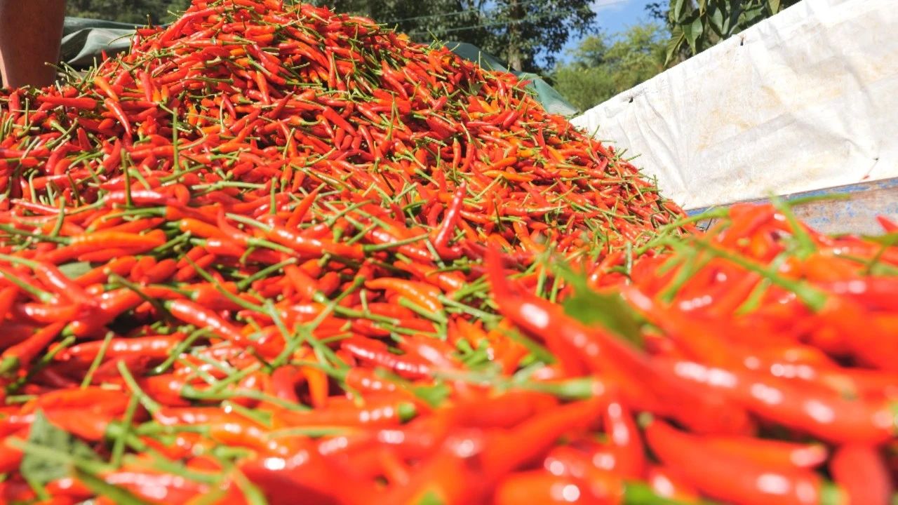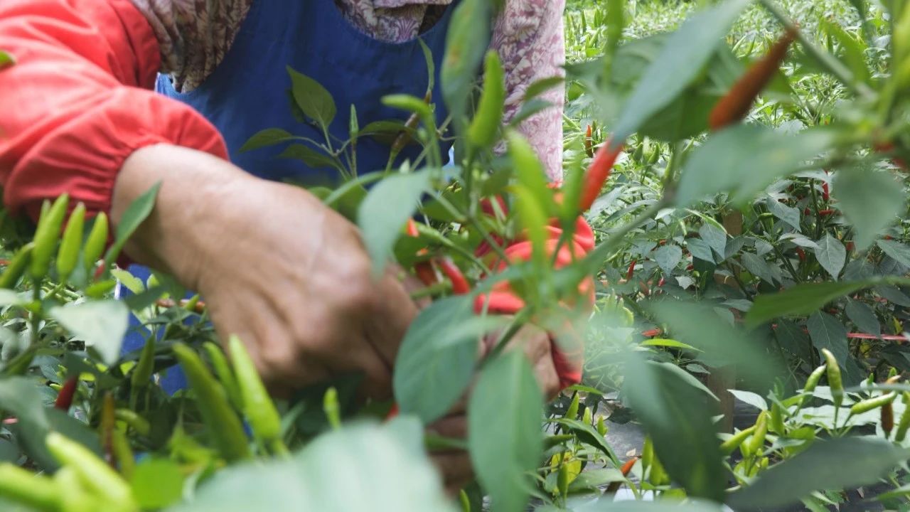 在田间地头,在繁叶深处青红交织的辣椒若隐若现,一株株辣椒挂满枝头,红绿相衬,果形饱满,色泽鲜亮,分外诱人,得益于当地良好的土壤气候条件,辣椒亩产可达2000斤以上。